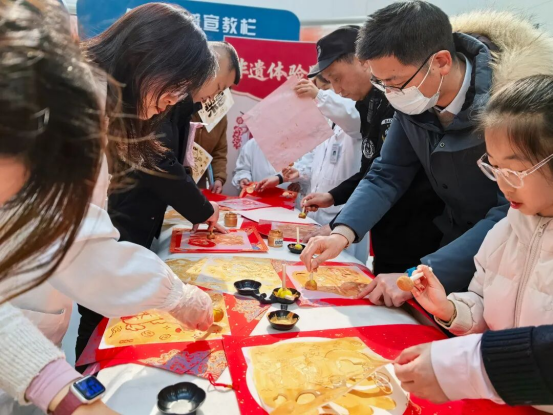 “非遗体验”拓印年画区,充满了好奇与童趣。木版年画是我国古老的民间艺术。在工作人员的指导下,大家亲手体验拓印的乐趣。均匀刷墨、覆上红纸、仔细拓压……当印有“年年有余”“家和万事兴”“骏马奔腾”等吉祥图案的年画渐渐清晰显现时,大家都发出了惊喜的赞叹。这亲手制作的年画,不仅是一张装饰,更是一份承载着传统文化记忆的珍贵礼物。